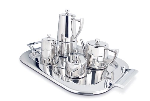 Serve espresso coffee and tea in grand style with this luxurious stainless steel ensemble from Cuisinox. The set consists of a 6 cup espresso maker, a 20 oz. teapot, a creamer, a sugar bowl and a tray. The perfect gift for that special somebody who has it all. Also makes a perfect house warming gift.